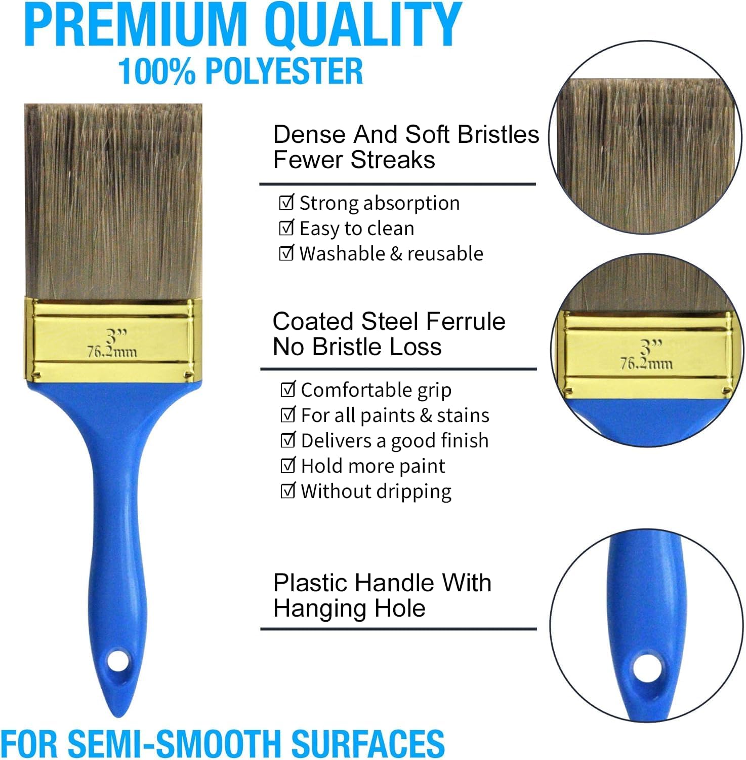 • These professional paint brushes make painting more perfect and efficient. The thickened 0.9-inch dense polyester bristles easily absorb more paint, reduce dripping, and create a smoother surface and more even painting.