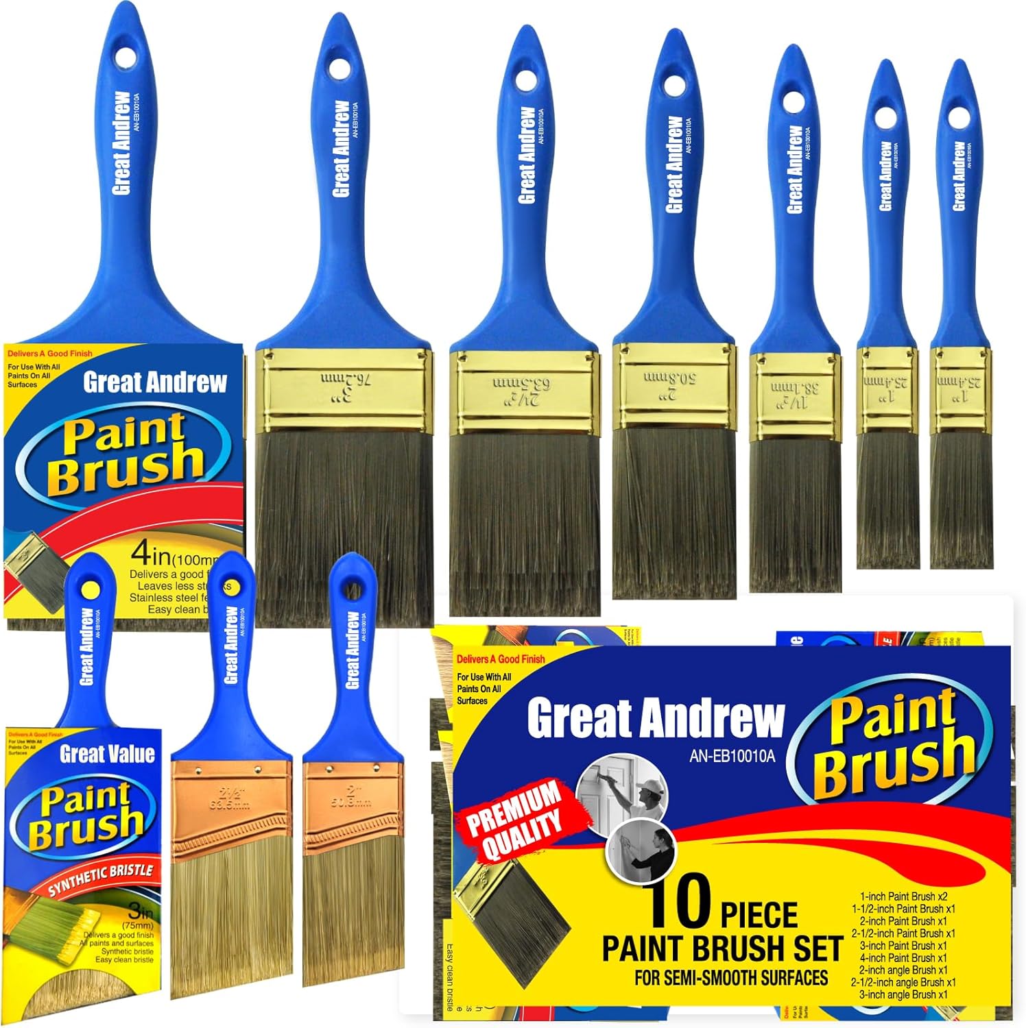 • Great Andrew 10 pack paint brush set includes: 7 flat brushes (1"x2 + 1.5" + 2" + 2.5" + 3" + 4") and 3 angled brushes (2" + 2.5" + 3"). Get all the common sizes of paint brushes in one go for your outdoor and indoor painting projects!
