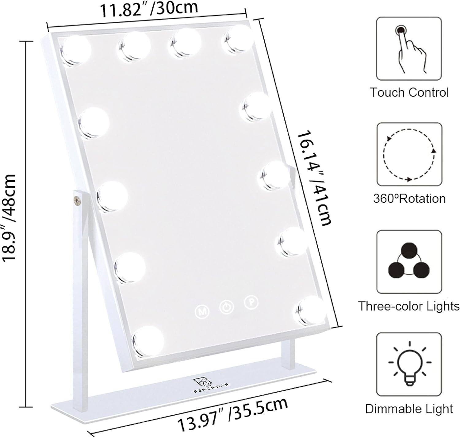 • Fenchilin makeup vanity mirror with lights is an idea vanity mirror that fits all sizes of your dressing table,13.97" X 18.9" size, solid with metal frame and base, built to withstand heavy use on your desk, the high-definition mirror makes your makeup more clearer