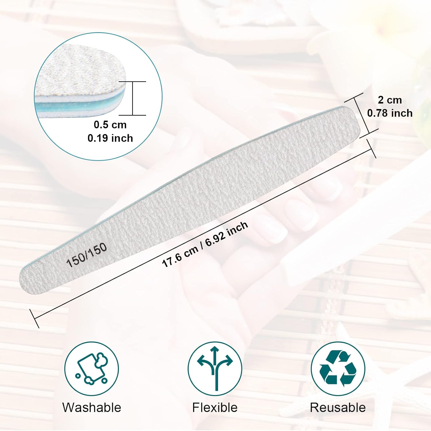 - 150/150 Grit Nail Files: Perfect size of 7.36 x 0.98 x 0.12 inches οΌ18.7*2.5*0.3cmοΌ, Delivers straight, clean sidewalls, coarse and rough gravel, polished fast, suitable for long fingernails fast grinding short