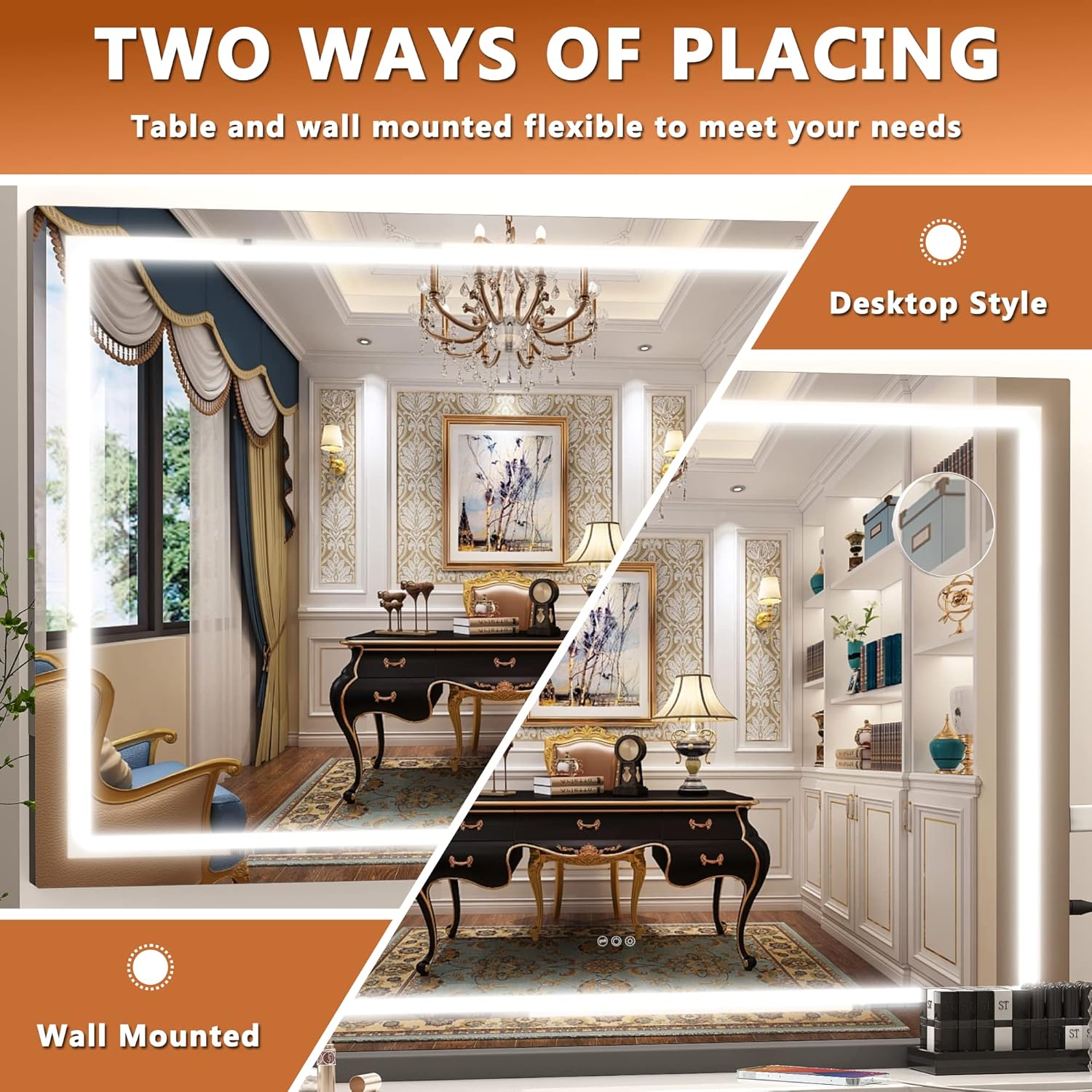 • 👍【Detachable Mirror Base & Hanging setting】Wall mounted or Table Top design meet your different needs.This large makeup mirror designed with detachable base and two back hole for nail. 1.Removing mirror base with a screwdriver. 2.Knocking two nails on the wall. 3.Hanging mirror on the wall.