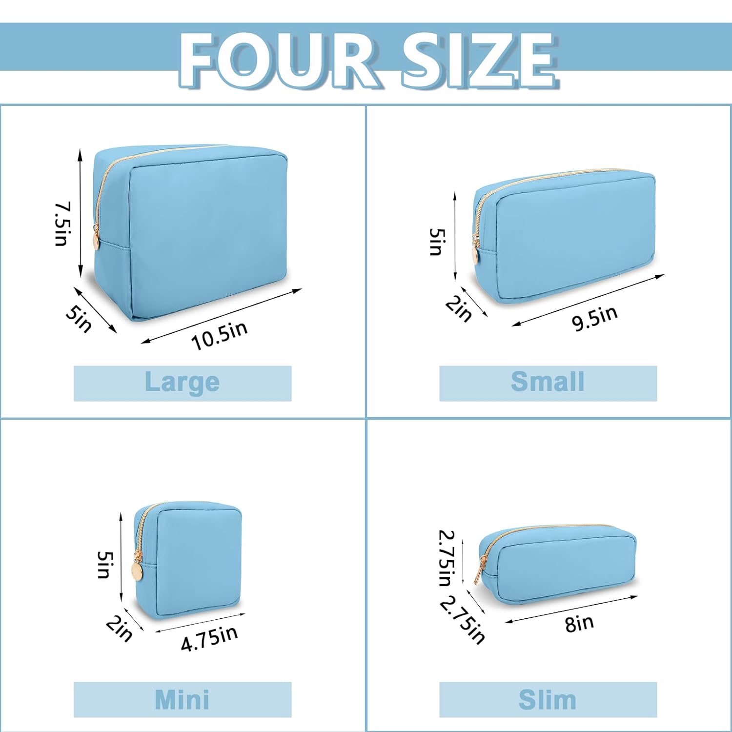 - 【Multiple Options】The cute makeup bag has four sizes, Mini(4.75''*2''*5''), Small(9.5''*2''*5''), Large(11''*5''*8'') and Slim(2.75*8''*2.75''). You can choose the right size according to the items you want to store. We have nine colors, Bubblegum, Sand, Chocolate, Periwinkle, Cotton Candy, Peach, Flamingo, Grape and Khaki. You can enjoy choosing the color you like.