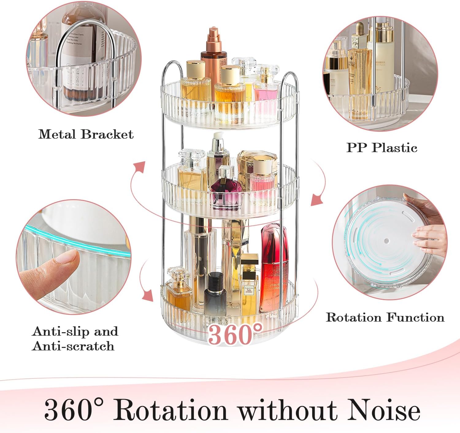 360° Rotating Makeup Organizer for Vanity, Spinning Cosmetics Organizer Holder Rack, Large Capacity Bathroom Organizer Countertop, Fits Perfume, SkinCare, Makeup Brushes 3 Tiers, Transparent