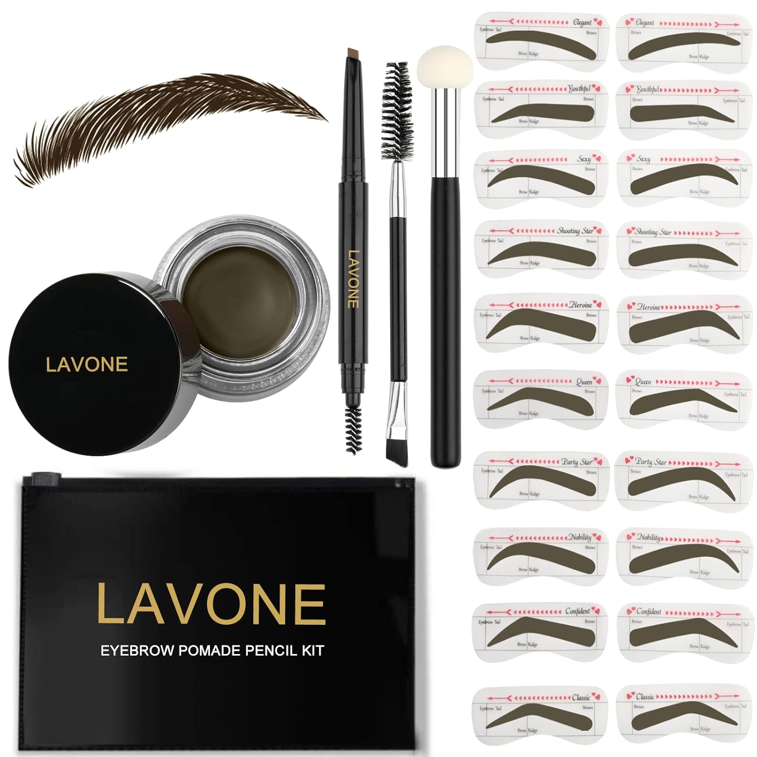 - [Whatโs in the eyebrow kit]: LAVONE makeup eyebrow kit includes brow pencil, eyebrow powder 20 eyebrow stencils (10 different shapes), a sponge applicator, a dual precision brush and a zipper pouch for on the go.