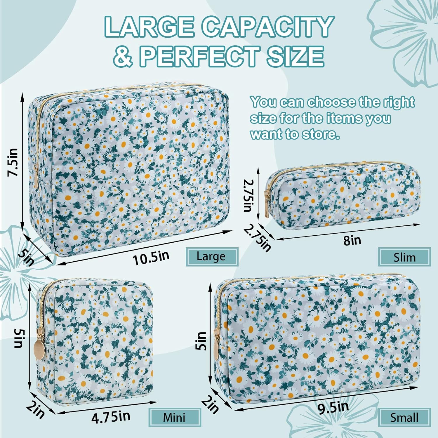 Waterproof Small Floral Makeup Bag Pouch for Purse,Nylon Flower Cosmetic Bag Preppy Travel Toiletry Storage Bag for Women Girl,Cute Makeup Organizer Bag Skincare Bag with Zipper(Small Green-Daisy)