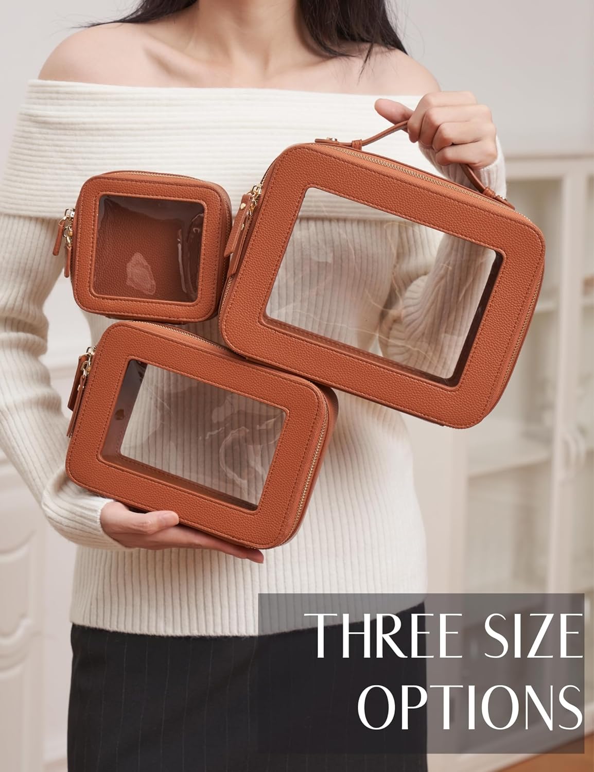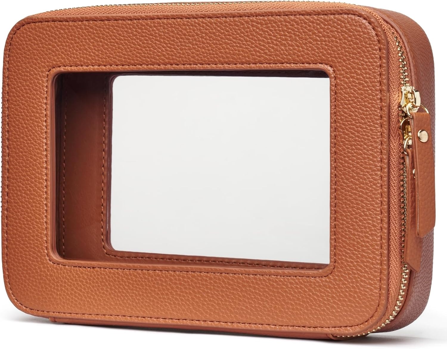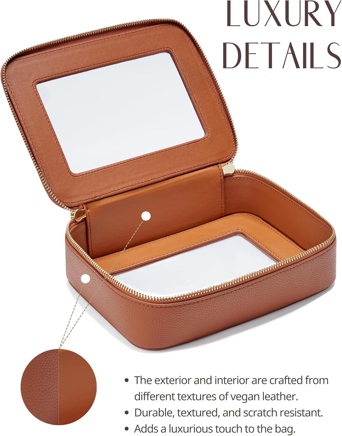 - [Premium Material and Durability] – The clear cosmetic case, both the exterior and interior, is crafted from high-grade faux leather, which is highly scratch resistant, durable and exceptionally easy to keep clean. It features a smooth zipper for secure closure, and elegant light gold metal hardware accents, adding a luxurious and sophisticated touch to the bag's overall design.