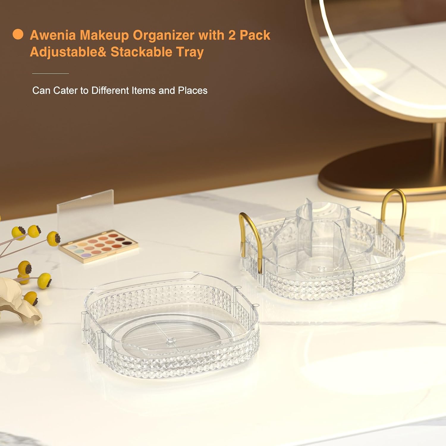 • Stackable &Adjustable:➤The lazy susan organizer is stackable if you get more Awenia clear bathroom countertop organizer and help you save 80% space.With separated top and raise,thicken edges, you can put long brushes,makeup bottle, don’t worry about falling. You can combine three adjustment plates of make up organizers according to your needs.