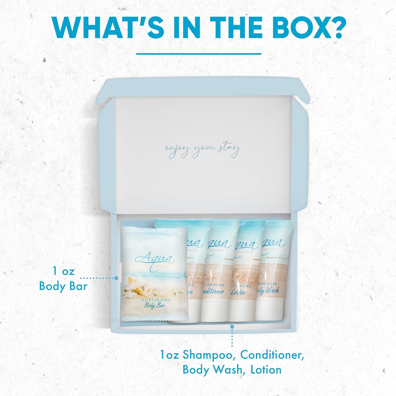 1-Shoppe All-In-Kit|Aqua Organics Amenity Kit|Boxed Hotel Toiletries|Bulk Set 1oz Travel Size Shampoo,Conditioner,Lotion,Body Wash & Bar Soap for Guest Hospitality AirBnB/Vacation Rentals|5 Pieces