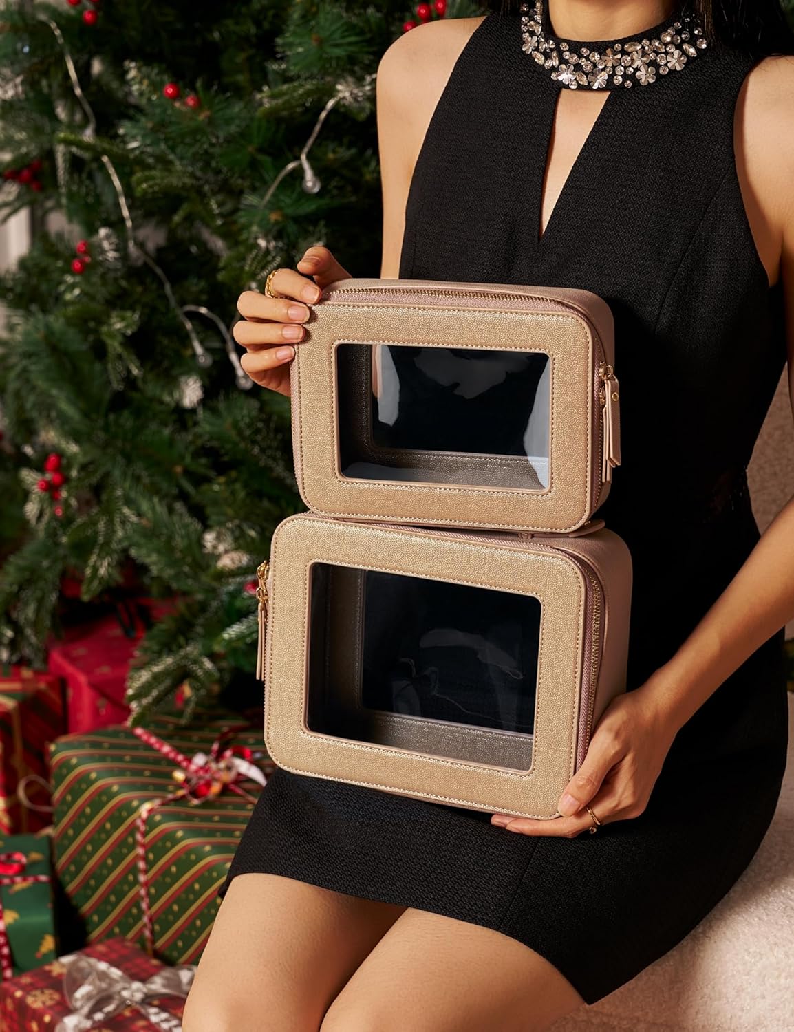 - [Compact and Portable] – The gold travel make up bag measures 8.3'' x 6.1'' x 2.4'' (21cm x 15.5cm x 6cm), designed to offer a compact and travel-friendly solution for organizing your makeup and toiletry essentials. It can be easily fit into a variety of bags, whether you prefer to carry it in a handbag, tote, or travel luggage.