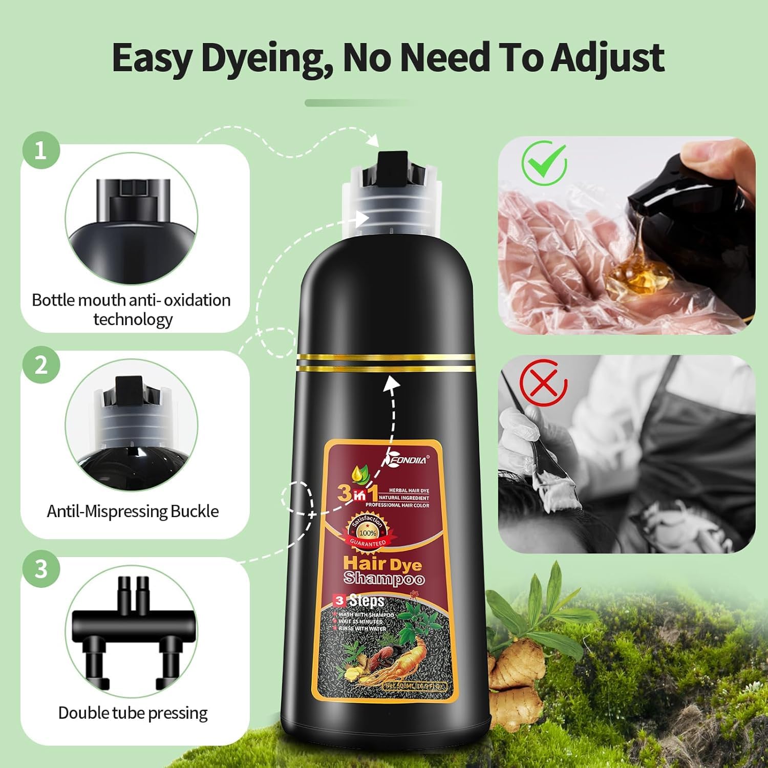 - Note: Different hair base colors dye out with slight deviation. When dyeing hair, it is recommended to apply cream at the intersection of hair and skin, so as to avoid dyeing to the skin. If you're not completely satisfied with our 3-in-1 hair coloring shampoo, we offer a 100% satisfaction guarantee. Try it out risk-free and see the difference for yourself!