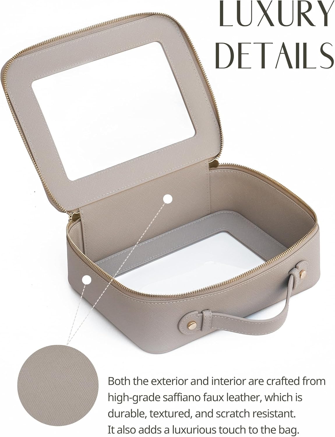 - [Premium Material and Durability] – The clear cosmetic case, both the exterior and interior, is crafted from high-grade saffiano faux leather, which is highly scratch resistant, durable and exceptionally easy to keep clean. It features a smooth zipper for secure closure, and elegant light gold metal hardware accents, adding a luxurious and sophisticated touch to the bag's overall design.