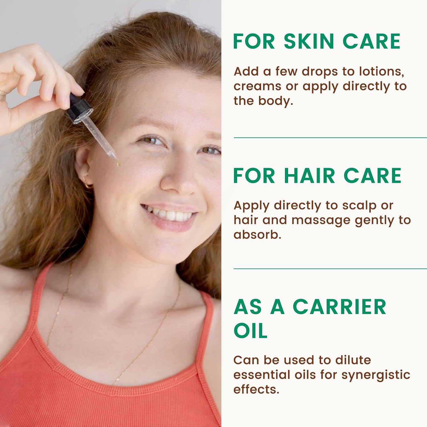 - Multi-Purpose Application: Use as a daily moisturizer, hair treatment, cuticle oil, or blend with essential oils for customized skincare solutions. Combined with various essential oils, it enhances skin absorption and is a good base oil. Add 1-3 drops with lotions, creams for your skin care, good carrier oil for daily use