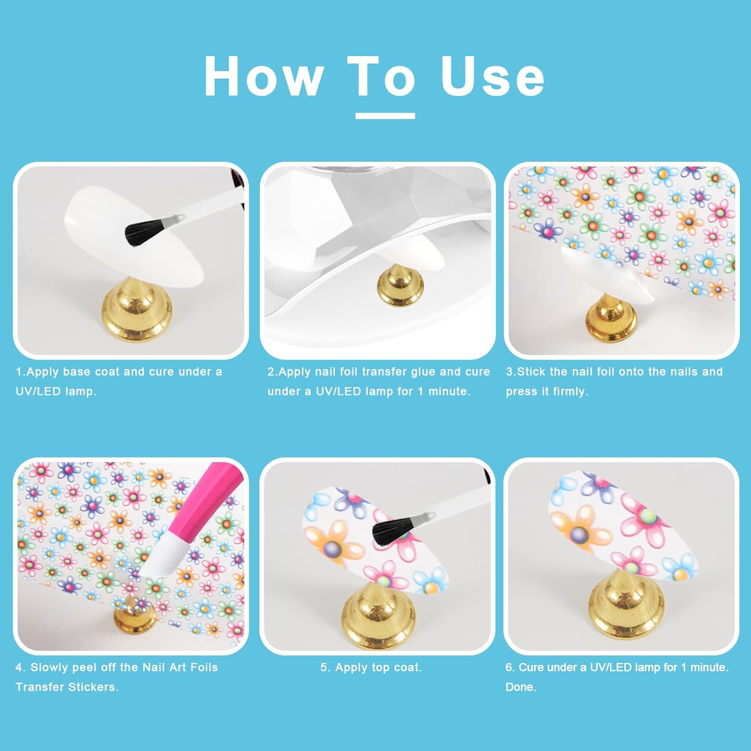 - Easy To Apply - Apply the foil adhesive on the bottom and wait for 2 minutes or use LED\UV nail lamp to curing; Choose your favorite pattern nail foil sheet and cut it to fit with your nail size; Tear off the backing film and transfer the pattern; Apply top coat and cure under LED/UV nail lamp. You'll get pretty nail foils nail art, with durable top coat can prolongs the foil result in daily life.